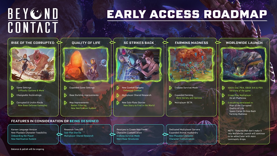 27/10/2021En el día de hoy, Koch Media y el desarrollador Playcorp han desvelado la hoja de ruta que resume la fase de acceso anticipado de Beyond Contact. También se ha anunciado que la aventura de supervivencia de ciencia ficción se lanzará en PlayStation 4, PlayStation 5, Xbox One y Xbox Series S|X y contará con la opción de juego multijugador cruzado en todas las plataformas.