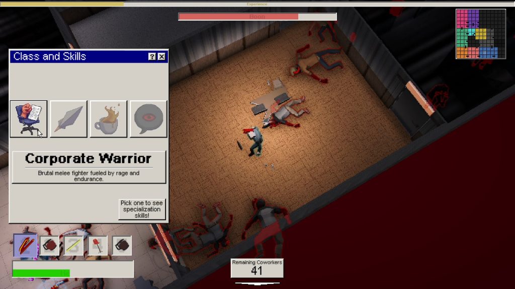 Desde el primer momento, el juego deja clara su identidad: no es un roguelike pausado ni metódico, sino una experiencia agresiva, veloz y deliberadamente caótica. El jugador se enfrenta a una torre generada proceduralmente, donde cada planta representa una iteración del infierno corporativo, plagada de enemigos, trampas y oportunidades de mejora. Esta estructura vertical no solo define la progresión, sino que establece un ritmo constante de avance, donde cada piso superado se siente como una pequeña victoria dentro de un sistema que siempre está empujando hacia el límite.