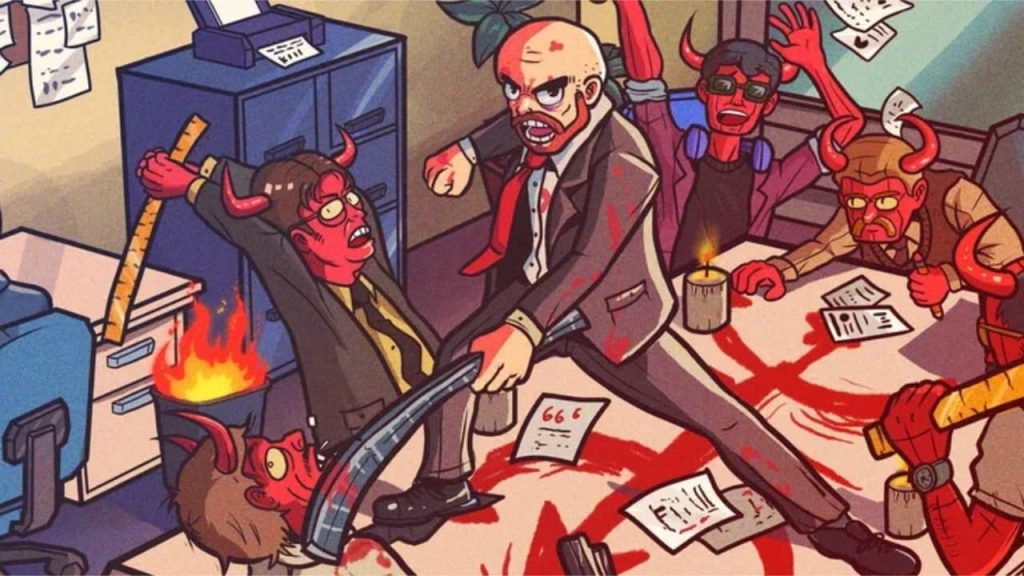Narrativamente, el juego no busca profundidad tradicional, pero sí construye una identidad clara. La idea del “infierno corporativo” no es solo un chiste, sino un marco temático que da coherencia a todo el sistema. Las mecánicas, los enemigos, los objetos… todo gira en torno a esta sátira del entorno laboral, convirtiendo la rutina en violencia y el estrés en caos jugable.