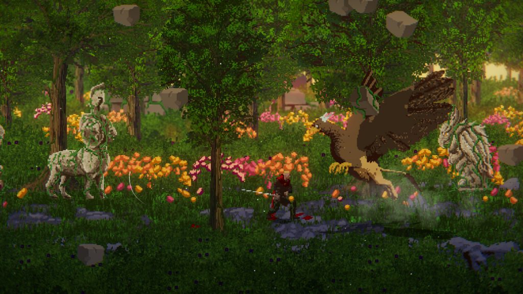 Visualmente, Crimson Capes destaca por su pixel art detallado y expresivo. La estética retro no solo evoca nostalgia, sino que permite leer la acción de manera clara incluso en situaciones de alta densidad de enemigos y efectos visuales. La animación de los personajes y de los enemigos es fluida y transmite la física de los combates, mientras que los efectos mágicos y de entorno refuerzan la espectacularidad de la acción. La paleta de colores oscura y coherente con la temática de fantasía sombría crea una atmósfera envolvente, donde la iluminación y los efectos de partículas no solo son decorativos, sino que también sirven como señales tácticas para el jugador. Cada escenario, desde bosques tenebrosos hasta torres místicas, está diseñado para transmitir un sentido de peligro y misterio constante, reforzando la inmersión y la narrativa ambiental.